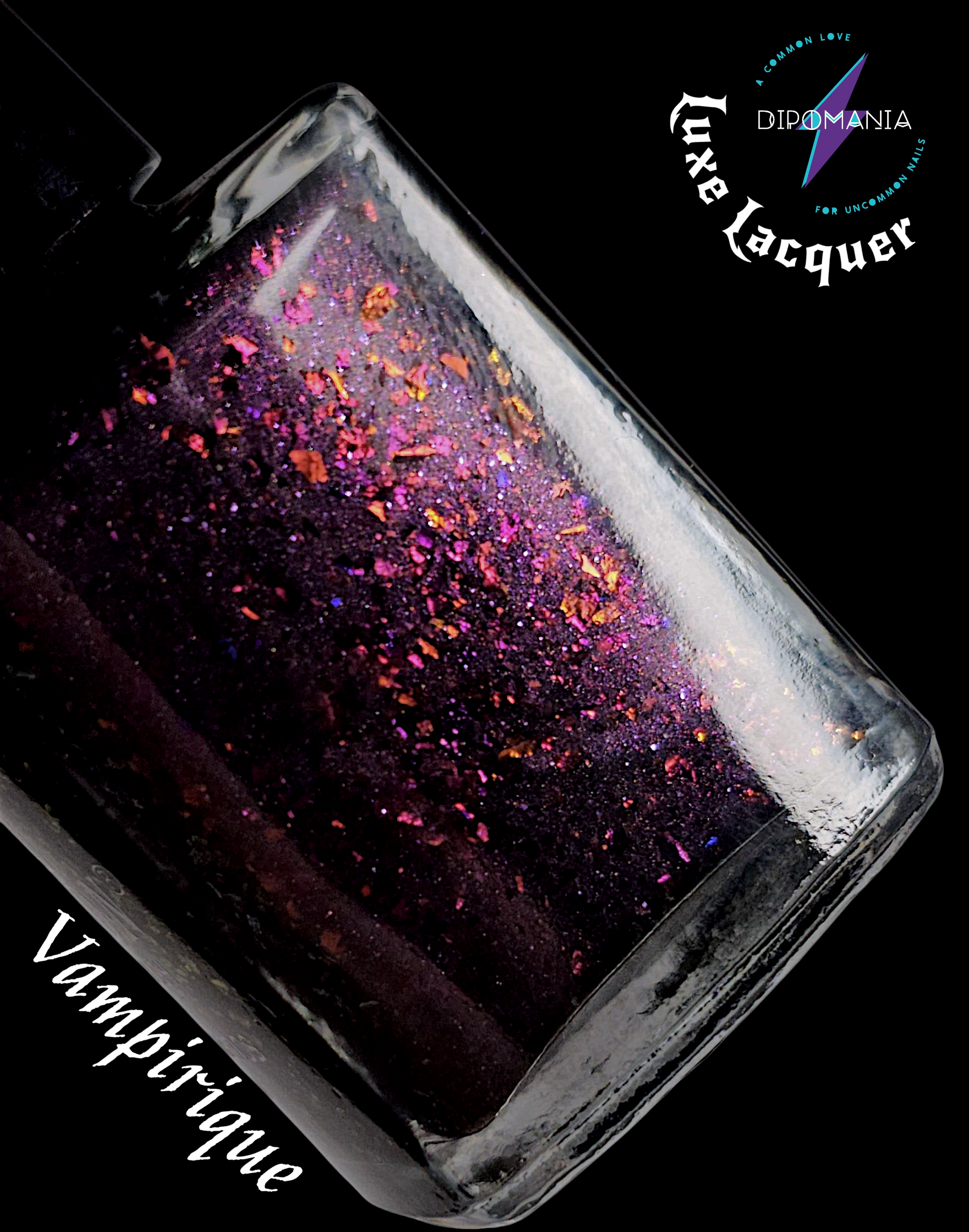 💫 Vampirique – a luscious plum-black shimmer streaked with shifting blood-red, orange and violet flakes. It glows like temptation under candlelight.