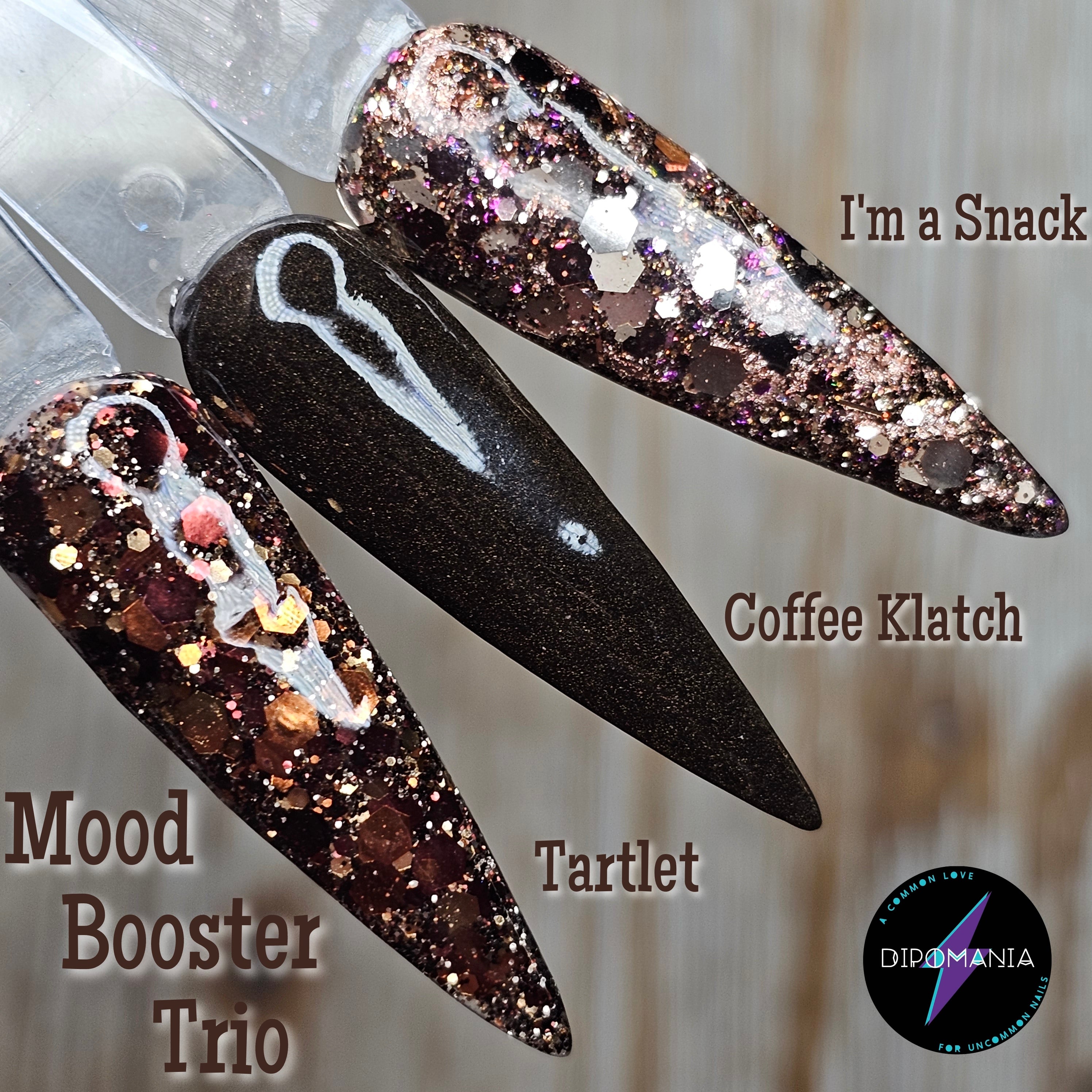 Treat yourself to a pick-me-up, you work hard, you deserve it! And by the way, if you don’t mind my saying so, you look absolutely fierce and fabulous doing it too! Never forget you earned that strut AND that well deserved break with the Mood Booster Trio at your fingertips. Chunky pink and gold glitter I’m A Snack reminds you you’re the ultimate tasty treat. Let your straitlaces loosen to led red and gold chunky glitter Tartlet peep through. And of course, never forget to give and receive the support of your besties over dark roast brown shimmer Coffee Klatch.